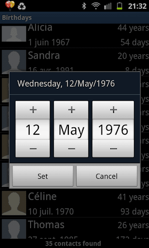 This application will allow you to add to each of your contacts (included synchronized Google accounts, Facebook …) their birthday date and name day.