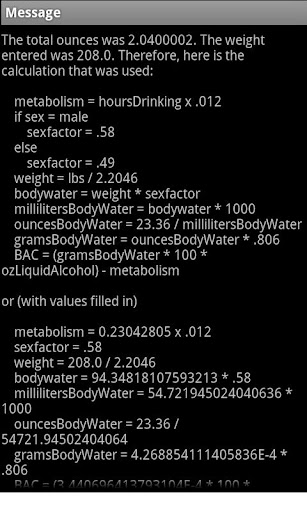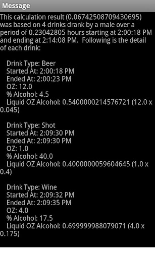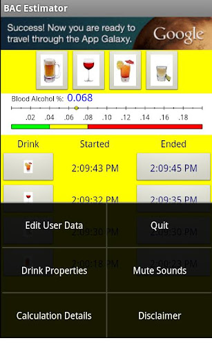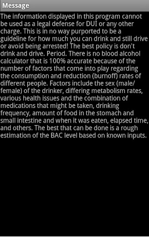 Don't take a chance with drinking and driving - know your limit! Estimates your blood alcohol content based on ounces, weight, hours, % alcohol! Keeps track of the ongoing BAC while you drink or even while you're waiting to 'sober up'.