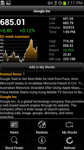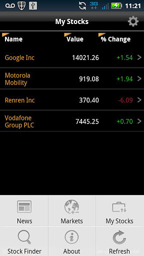 对国内外股市、期货、汇率、石油、黄金等交易感兴趣的试试这个。在My Stocks的编辑Edit输入股票代码即可显示,点Markets可看到全球股市行情,非常不错的一款软件。