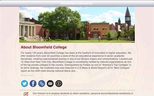 This is the official mobile app of the Bloomfield College Office of Admission. Its features include an About the College section, news, social media feeds and interactivity, photo and video albums, a map, click-to-call, click-to-email, a live album, inquiry form, application fee waiver coupon, and an event calendar.