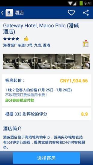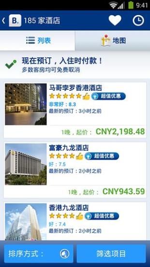 Booking.com在安卓手机和平板电脑上提供530000多家住宿,方便您手指轻划,安全预订。在这里,您可随时随地找到理想的住处,获得最优价格保证。找到最完美的住宿地点- 在找今晚的优惠酒店?只需轻轻一点,就能找到您附近最理想的酒店,并可以通过“最后一刻优惠”节省开支。- 正在计划行程?您可以搜索全球206个国家的69000多个目的地。- 酒店名称和地址均以中文和酒店所使用的语言显示。- 根据您的需要为酒店排序:按照最优惠价格、优惠、客人评分、与当前位置的距离等排列。- 使用筛选条件细化您的搜索结果:设置价格区间、选择某一区域、特定某些设施和服务(如提供免费无线网络连接等)。- 切换至地图显示模式,在您选定的区域范围内搜索酒店。- 我们不仅仅提供酒店,还提供众多别墅、公寓、住宿加早餐旅馆以及旅舍等等。