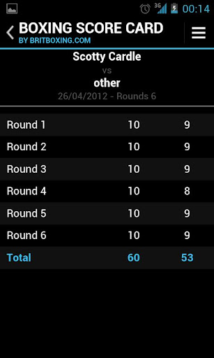 This is a simple app to let users score boxing matches as they watch them and keep a record of their own person score cards which they can then compare with the judges and friends.