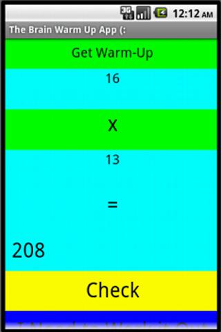 The Brain Warm-Up App is an App that helps you figure out a few math problems before starting any activity to improve the performance of your brain. With the press of button created a random warm-up math question will appear to help warm up your brain! All the questions are multiplication, division, subtraction or addition. The App also checks the the answer, says if the answer is correct or not, gives you the answer if you can't figure it out, AND gives you a space to work out the problem.