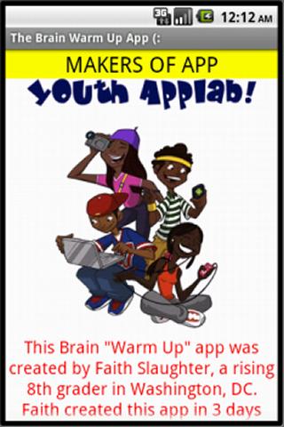 The Brain Warm Up app was created by Faith Slaughter, a rising 8th grader in Washington, DC. This app took three days to make.