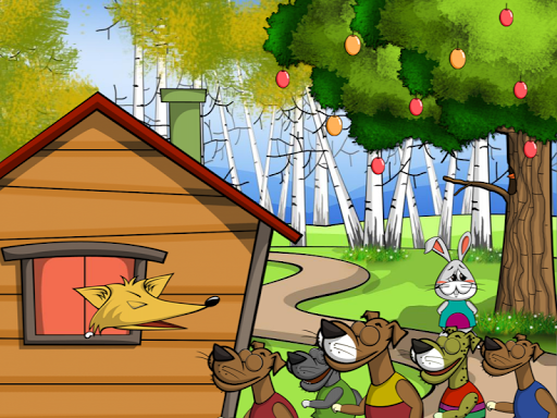 Ngày xửa ngày xưa trong khu rừng nọ có một con Cáo và một con Thỏ. Cáo có một ngôi nhà bằng băng, còn Thỏ có một ngôi nhà bằng gỗ. Mùa xuân đến, nhà Cáo tan ra thành nước, còn nhà Thỏ vẫn nguyên vẹn. Cáo xin sang nhà Thỏ sưởi nhờ rồi đuổi luôn Thỏ ra ngoài. Thỏ vừa đi vừa khóc. Một lát sau Thỏ gặp bầy Chó.