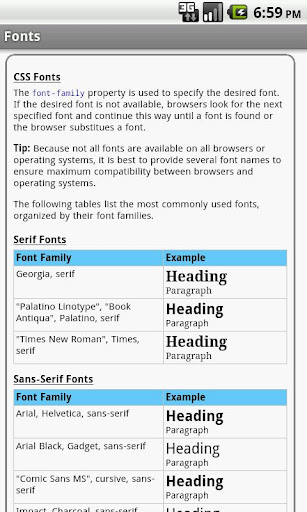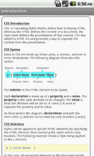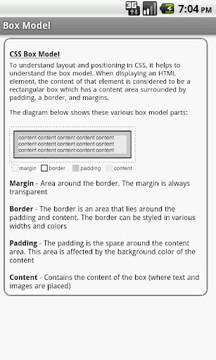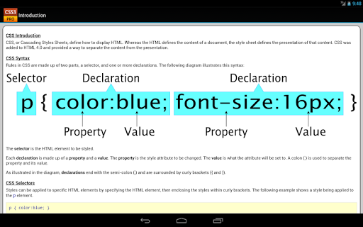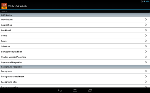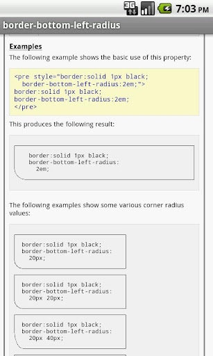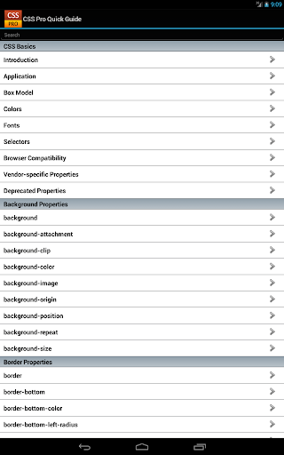 The CSS properties are categorized and searchable. Each property information screen contains a property description, values the property accepts, examples, browser compatibility, and version information. In addition, some properties include the display results of the various property values (e.g. border styles, text decoration, etc.).