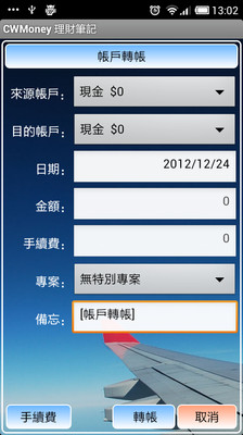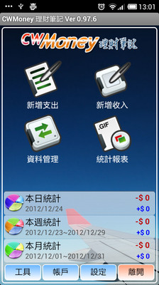 CWMoney是一套完全免费的 Android 记帐软体,特色是可以很快的在手机上记录下每天的开销,并作为每个月检视自己开销的工具,记帐介面提供拍照功能、计算机、语音辨识(专门针对懒得打字的人)、分类、多帐户(多币别)等功能;另外这个版本还提供了预算功能,如果想有效控制自己开销的人,可以在每个月提早输入自己本月的预算,程式提供圆饼图与条列图参考,设定上也新增GPS功能与快速记帐功能,并提供Widget、捷径速记功能,最特别的是内建了多组样式可供选择(包含女性朋友强烈要求粉红样式),最后希望这个软体能让大家养成记帐习惯,早日达成自己的财富理想。