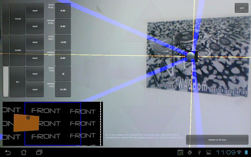 On the left side you can choose operation you want to perform with your virtual camera (move, rotate, vertical field of view angle change). To increase/decrease horizontal or vertical parameters just swipe your finger along screen X or Y axis.