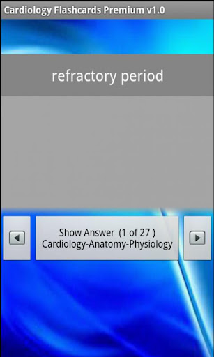 Cardiology Flashcards Premium, a study aid for doctors, nurses and medical students studying Cardiology. Decks included: Abbreviations, Anatomy-Physiology, Doppler, Drugs, EKG, Circulation, Pathology, Hyperlipidemia. Developed for phones and tablets, Nexus 7, N7, Kindle Fire, Galaxy Tab