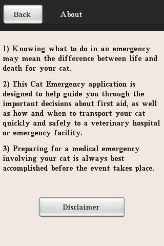 * This Cat Emergency app is designed to help guide you through the important decisions about first aid, as well as how and when to transport your cat quickly and safely to a veterinary hospital or emergency facility.