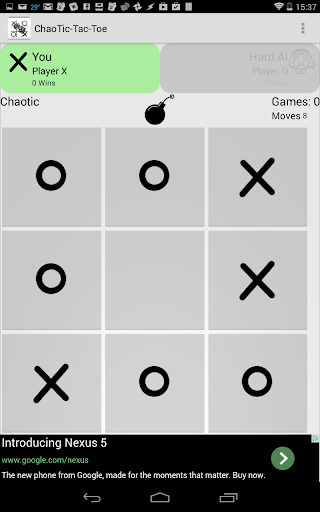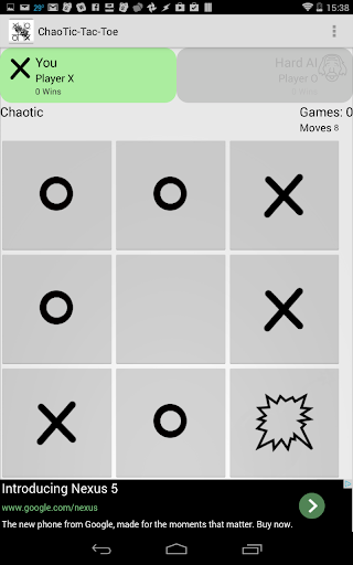 Chaotic-Tac-Toe is an Android App game where you can play traditional Tic-Tac-Toe as well as some more interesting "chaotic" or randomized versions of Tic-Tac-Toe against the computer or friends either locally or over a network.