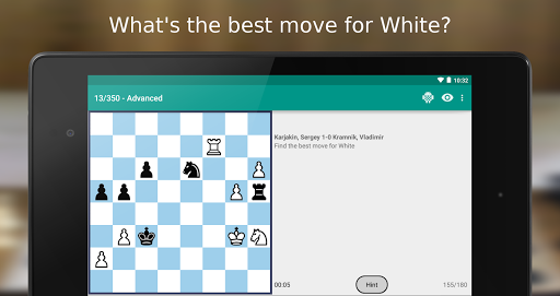Chess puzzles are an ideal way to practice without having to find an opponent or spend time playing an actual game. iChess presents 1000 offline puzzles from real FIDE tournament games. Just launch and start solving!