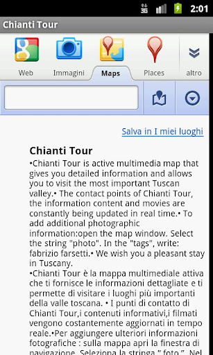 •Chianti Tour is active multimedia map that gives you detailed information and allows you to visit the most important Tuscan valley.