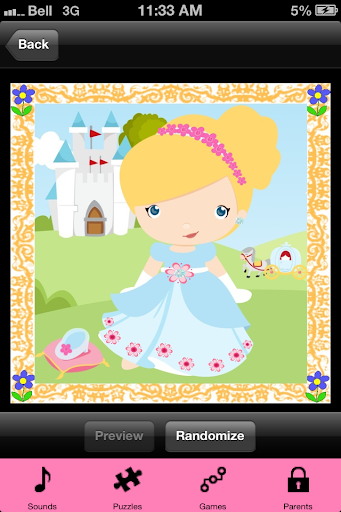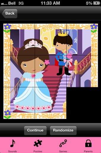 2. Let them tap randomize, slide a few pieces and then tap the back button. This is a simple way to introduce them to using the Cinderella fun games app, develop fine motor skills, and it’s very entertaining for them to see the puzzles scramble.