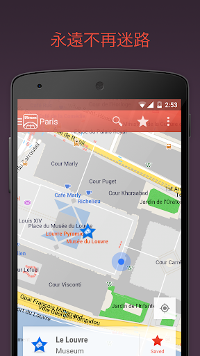 出發之前將離線地圖和旅遊攻略儲存在您的設備上,即使沒有網路也能讀取資訊,海外旅行也無需流量。不論您的設備是只能使用無線網路或是您人正在海外旅遊想要節省流量或漫遊費,迅速可靠的CityMaps2Go的所有功能,就算離線也能使用,如搜尋地址,建立評論,增添個人筆記,以及GPS定位。(但若欲與酒店訂房,請先確定已有網路連線且能下載資料)