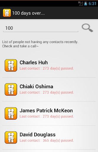 "100 day over..." : You can find peoples do not have a contact with during specific periods. Just tap and call with them.