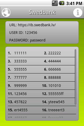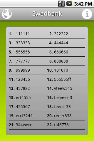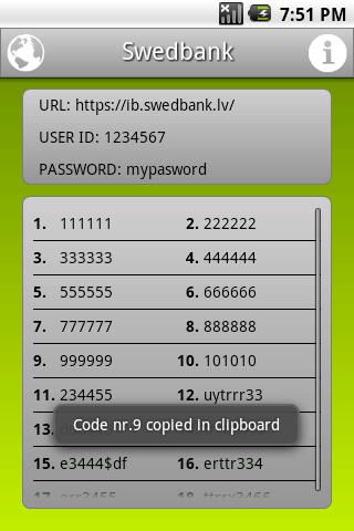 Code Cards allows you to store codes of your internet banking code cards in your Android mobile device. You can save as much code cards and codes as you want.