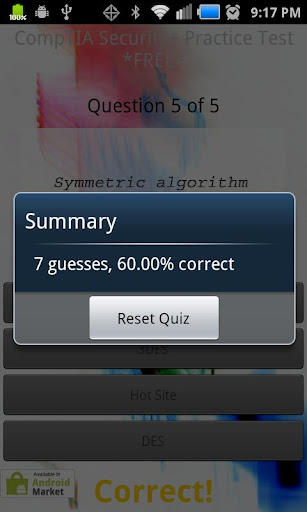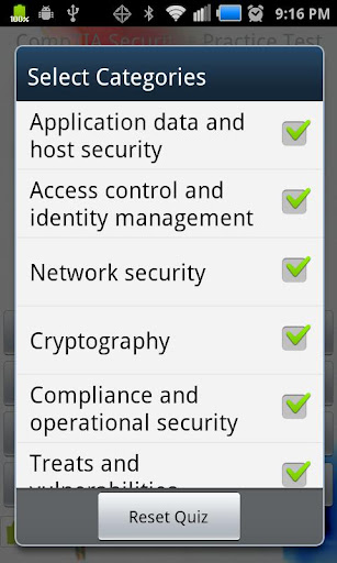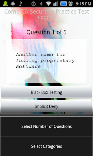 This FREE version of CompTIA Security+ SY0-301 Practice allows you to take a 5 question test from a question pool of 30 where each category contains 5 questions.