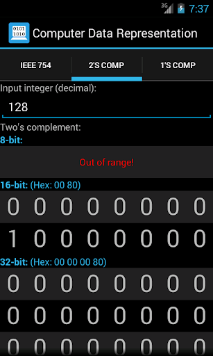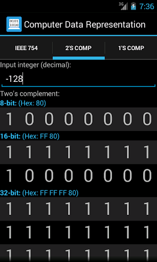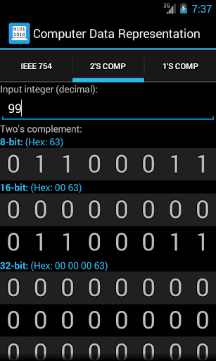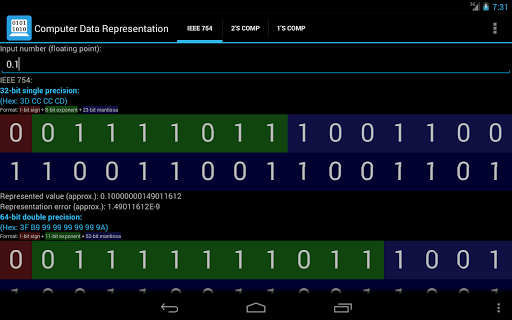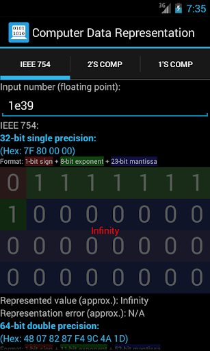 A tool of computer data representation for computer science students and professionals. It supports IEEE 754 floating point numbers, two's complement and one's complement of integers. For IEEE 754, the actual represented value and representation error for a number are displayed for analysis. Binary data can be input conveniently by simply touching a digit to toggle it between 0 and 1.