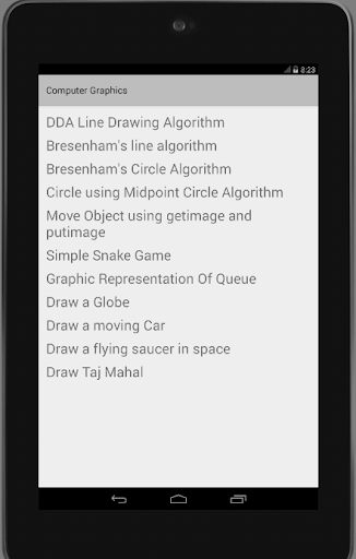 This app contains programs on Computer Graphics written in C language. The programs are made on Borland Graphical Interface (BGI) , which is the part of Turbo C.