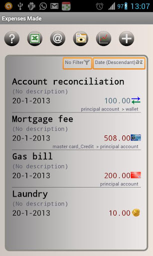 Control Expenses in a highly flexible powerful application that lets you control your expenses and income through lists, and even if you wish, you can control the finances of your home or your business thanks to the posibility to create accounts, purses and fictitious loans.