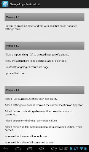 Press the "Get Current Location" icon or manually enter any coordinate and this App will convert whatever was entered into other commonly used coordinate formats.