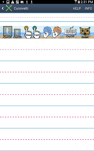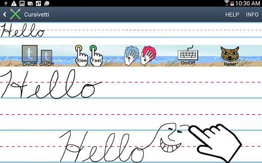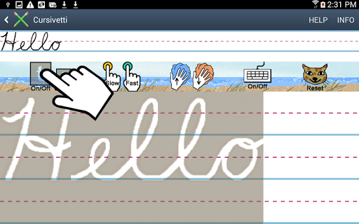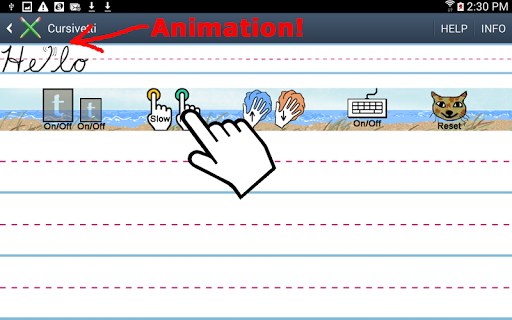 This app provides a way to observe, learn, and practice cursive writing. Using the keyboard, alphabetic characters are entered into the demo area where they appear in cursive form and can then be animated as cursive writing. These same letters can also appear, upon clicking the template button, in the writing area as a tracing template. Handwriting entered on the template (with either finger tracing or a stylus) stays visible after the template is turned off. The user can also practice writing without the template.