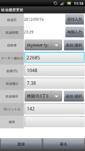 基本的に、給油の時に、その時の給油対象の車orバイク、メーター値、給油額(円)、給油量(リットル)、給油場所(任意)を入力し、保存するというアプリです。