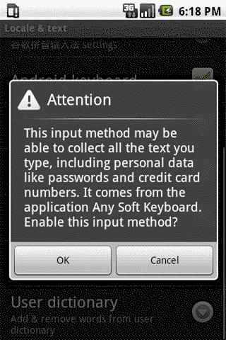 A dialog box will open and will warn you about possible key-logging attacks which can be done by this keyboard application. Note: This is a generic message, and will be shown when you enable any keyboard application.