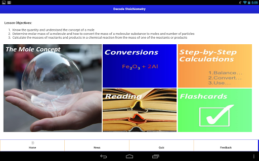 Decode Stoichiometry will take you through the basics of introductory chemistry terminology and share information about how to balance chemical equations. Text, videos, flashcards, ties to current events are all here in one friendly tablet-optimized interface.