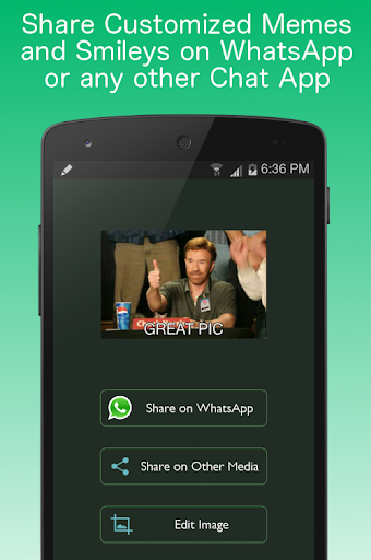 We have close to 300 high quality smiley faces and memes, and we update our database very frequently. The coolest feature of the app is that you can use it as a meme generator. So you can select the image from our huge database or you can click a pic of yourself and turn it into your own super cool meme. You can edit the pic with the powerful imaging editor by adding text, drawing, adding stickers, sketching, etc.