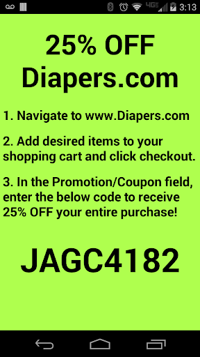 This app provides instructions on how to apply the 25% OFF Diapers.com coupon code. In order to use the promotion code, you need to go to www.Diapers.com. Simply apply the code: "JAGC4182" in the Promo/Coupon section at checkout. Remember, this code is SITE WIDE and is good for your TOTAL PURCHASE!