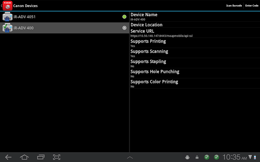 Canon’s app allows users to print files (emails, PDFs, TXT, TIFF, JPG, and Photos) directly from their Android tablets and phones to Canon imageRUNNER/imageRUNNER ADVANCE MFPs and certain MEAP-enabled imageRUNNER LBPs***. Users can also scan hard copy documents to their Android tablets and phones.****