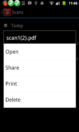 9) You are now ready to use the Canon Direct Print and Scan for Mobile application to print email attachments, saved files, and files from other applications that are PDF, TXT, TIFF, and JPG.