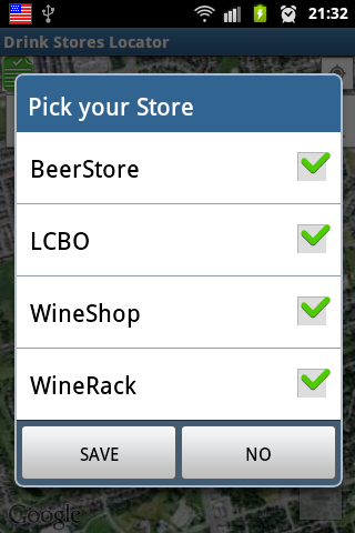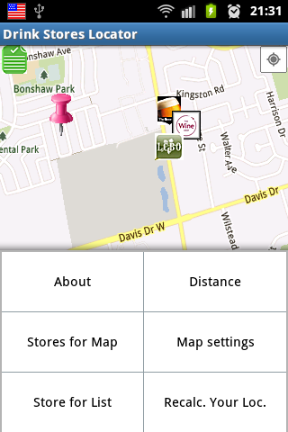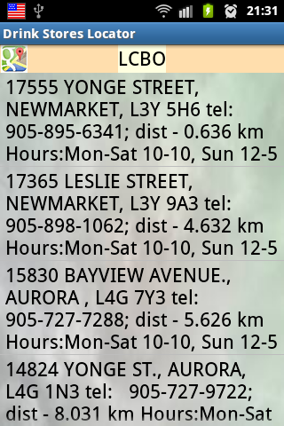 This program show your location and location near you selected stores LCBO, Beerstore, WineRack, WineShop. Application show on the map stores and distance between you and stores. You can press on store and you will get address of store and make a call.