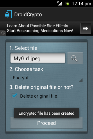 DroidCrypto is a simple and easy-to-use tool for encrypting and decrypting your files in android phone. If you want to keep your file safe from other people, this is a tool for you.