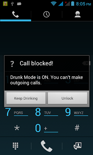 This app blocks the Outgoing Calls, SMS, MMS, WhatsApp, Viber etc when the drunk mode is turned on!