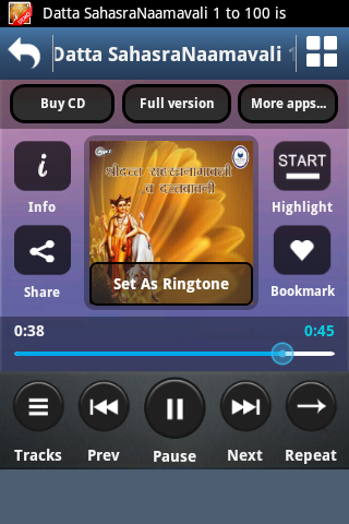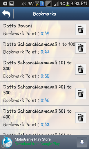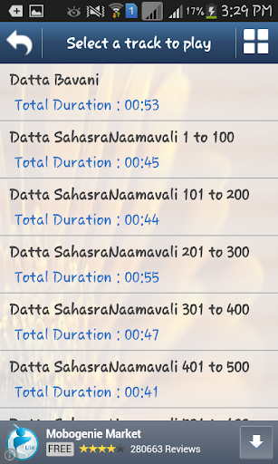 Shree Dutt Naamavali comprises of 1000 holy name chnats of Guru Dev Dutt along with Marathi Translation of Duttbavani.This demo app contain sample Tracks of Dutt Sahasranaam.