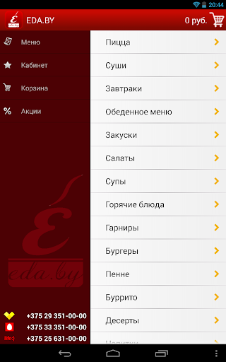 Наше меню: пицца, суши, завтраки, обеды, супы, горячие блюда, салаты, закуски, десерты, напитки и др.
