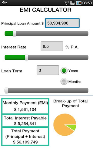Use the slider to adjust the values in the EMI calculator form. If you need to enter more precise values, you can type the values directly in the relevant boxes provided above. As soon as the values are changed using the slider, EMI calculator will re-calculate your monthly payment (EMI) amount. Along with your EMI payment amount, you also get other useful data including :