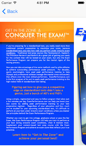 The Exam Performance Program is designed for all aspirants who want to perform better based on peak performance training techniques derived from the fields of neurology, clinical and sports psychology. This helps aspirants to be calm, confident and stay focused to perform best under stressful conditions. People who are unprepared to handle stressful conditions and the mental rigors can result in panic or "choke" under pressure and disappointing exam scores. It is a great supplement to traditional test-prep courses and self-study; it's the first app of its sort to apply peak performance training to the high-stakes field of standardized test-taking.
