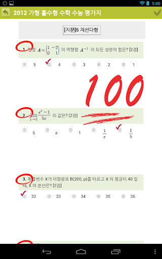 - 수능평가지 한 쪽의 한 열을 보는 것과 같은 평가지 보기모드 및 채점후 점수확인 기능이 있습니다.