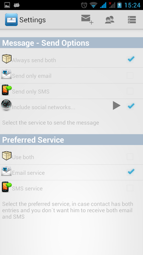 If you want to send the same message to multiple contacts, for which you can have only the email address or the phone number, or both, you don´t need to send separate messages for each service. Simply type once, select your recipients list and send it. Easy and Simple!