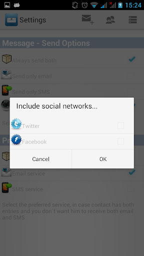 Easy Email, SMS, and Social Network messaging. Reach all your contacts by Email or SMS and post to Facebook or Twitter, writing just one message, saving your precious time! Create and reuse custom messages. Create custom contact groups!