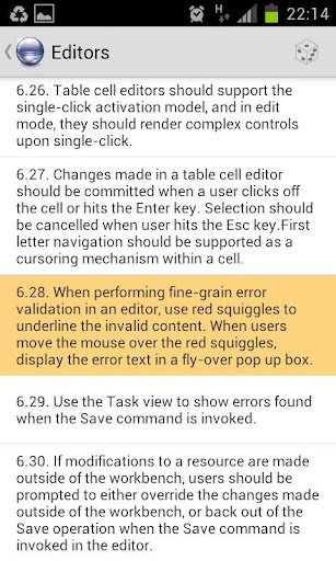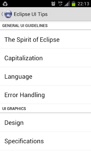 Did you know that there are 144 guidelines defined for building usable Eclipse user interface? If you are an Eclipse plug-in developers, this app will help you to refresh your knowledge about these guidelines. You can browse through all of the Eclipse UI Guidelines. You can also enable the "tip of the day" feature which shows a random guideline every day as a status bar notification.
