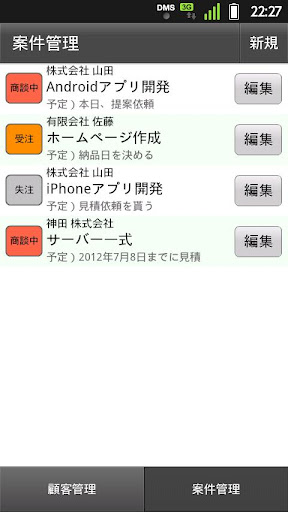 案件の一覧では、顧客名、案件名を表示し、次のアクションとなる
