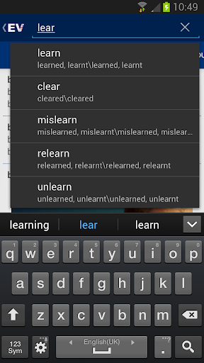 The dictionary shows 3 forms of all verbs. You can search the dictionary by all forms as well as a translation. The dictionary also allows you to listen to pronunciation of all verbs as well as mark your favourite verbs for convenient learning.
