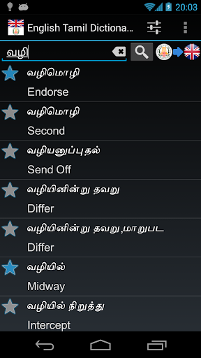 * Listen to the correct pronunciation in British or American English and Tamil (if installed) using Android's built-in Text-to-speech synthesizer
