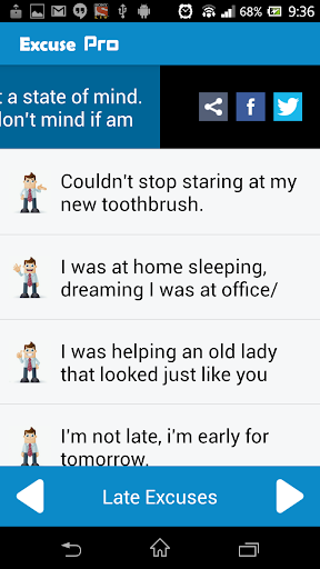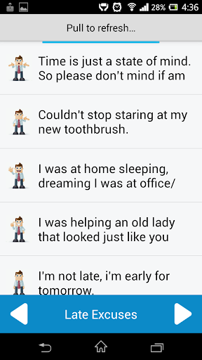 We all love making excuses, so, here is an android application which will help you to get out of trouble next time when you are late at work, late for college lectures, caught cheating on your girlfriend/boyfriend, etc (Beware! They might push you into trouble too). Just go ahead and download our free application and start having fun making Excuses.