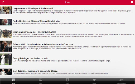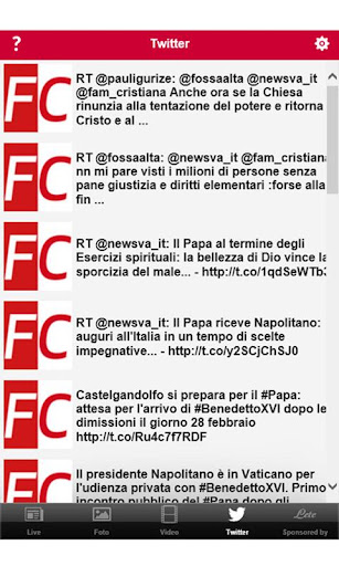 FC Conclave LIVE è L'applicazione di Famiglia Cristiana per seguire in diretta gli eventi legati alle dimissioni di papa Benedetto XVI e alla elezione di papa Francesco. Notizie, approfondimenti, foto, video e la diretta twitter per essere aggiornati in tempo reale su quanto sta avvenendo a Roma. FC CONCLAVE LIVE ti permette di accedere dal tuo Smartphone o Tablet Android ai contenuti prodotti da una redazione di esperti vaticanisti e ascoltare le interviste in presa diretta ai protagonisti di uno degli eventi più formidabili del nostro tempo. Con FC CONCLAVE LIVE sei dentro la Storia.